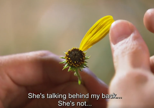 ஜோவன் இப்போது தன் தோட்டத்தில் வெளியே அமர்ந்திருக்கிறான், கையில் ஒரு பூவை வைத்திருக்கிறான். அவன் ஒவ்வொரு இதழாகப் பறித்துத் தரையில் போடுகிறான். ஒவ்வொரு இதழைப் பறித்துப் போடும்போதும், “அவள் என்னைத் திட்டுகிறாள், அவள் என்னைத் திட்டவில்லை; அவள் என்னைத் திட்டுகிறாள்; அவள் என்னைத் திட்டவில்லை…” என்று சொல்லிக்கொண்டே வருகிறான். கடைசி இதழைப் பறித்துப் போடும்போது, அது “அவள் என்னைத் திட்டுகிறாள்” என்பதில் முடிகிறது. இது அவனுக்குக் கோபத்தை ஏற்படுத்துகிறது. அவள் எப்படி அவனைத் திட்டலாம்? ‘தவறு செய்தது அவள்தான்’ என்று நினைத்து, தன்னைத் திட்டியதற்காக அவள் மீது கோபப்படுகிறான். அவன் கோபமாக எழுந்து அங்கிருந்து நடந்து செல்கிறான். அவள் மீது ஏற்கனவே இருக்கும் கோபத்துடன், ‘இந்த பூவின் கோபமும் அவளால்’ என்று ஆகி விட்டது போல….